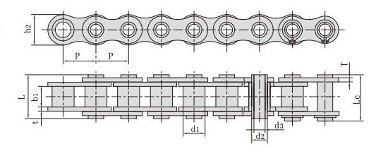 鏈號 節距 套筒直徑 內節內寬 銷軸直徑 銷軸長度 內鏈板高度 鏈板厚度 破斷載荷 每米長重