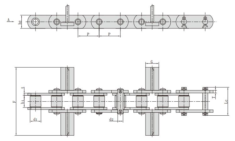 鏈條型號 節距 滾子直徑 內節內寬 銷軸直徑 銷軸長度 內鏈板高度 鏈板厚度 附板尺寸 抗拉強度 每米長重