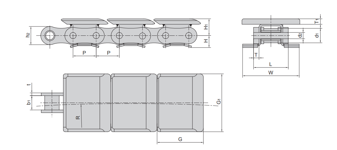 鏈條型號 節距 滾子直徑 內節內寬 銷軸直徑 銷軸長度 內鏈板高度 附件尺寸 側彎半徑