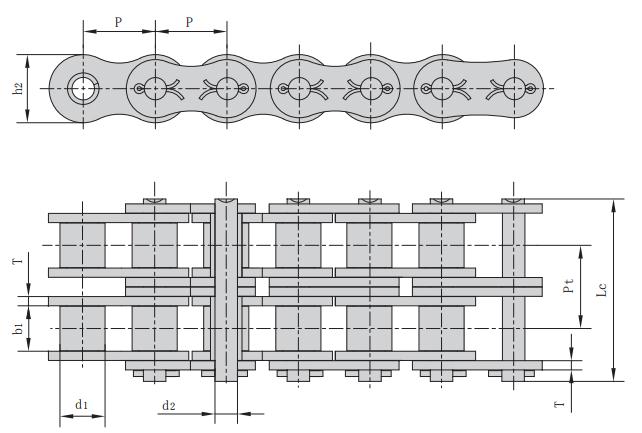 鏈號 鏈號 節(jié)距 滾子直徑 內(nèi)節(jié)內(nèi)寬 銷軸直徑 銷軸長度 內(nèi)鏈板高度 鏈板厚度 排距 抗拉強(qiáng)度 平均抗拉強(qiáng)度 每米長重