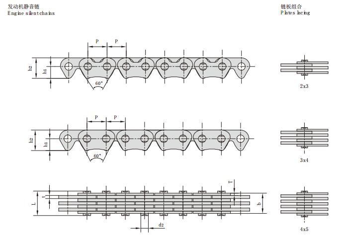 汽車發動機正時靜音鏈主要型號有:節距,鏈寬,銷軸直徑,銷軸長度,鏈板高度,鏈板厚度,導向型式,片數,抗拉強度,每米長重