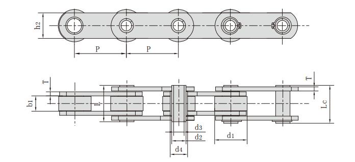鏈號(hào) 節(jié)距 滾子尺寸 套筒直徑 鏈板高度 內(nèi)節(jié)內(nèi)寬 銷軸直徑 銷軸長(zhǎng)度 鏈板厚度 抗拉強(qiáng)度