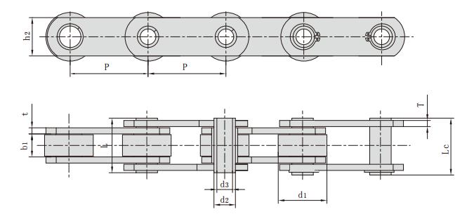 鏈號 節距 滾子直徑 內節內寬 銷軸直徑 銷軸長度 內鏈板高度 鏈板厚度 抗拉強度 平均抗拉強度 每米長重