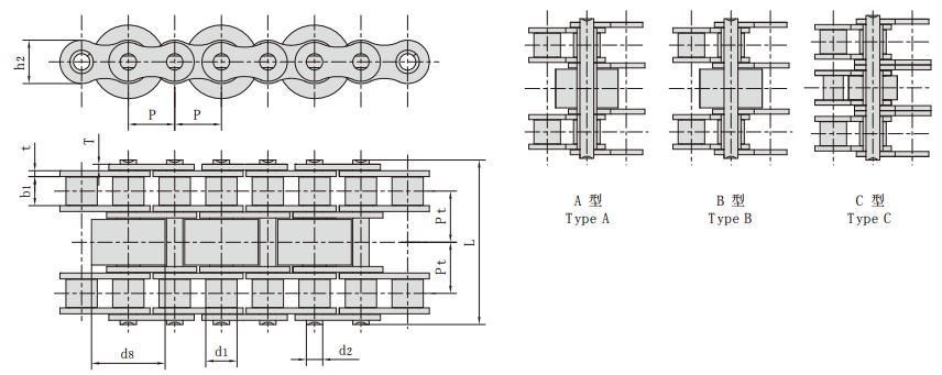 鏈號(hào) 節(jié)距 滾子直徑 內(nèi)節(jié)內(nèi)寬 銷軸直徑 銷軸長(zhǎng)度 鏈板尺寸 排距 抗拉強(qiáng)度 平均抗拉強(qiáng)度 型號(hào)