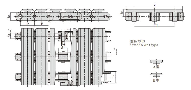 鏈號 節距 滾子直徑 內節內寬 銷軸直徑 銷軸長度 鏈板高度 鏈板厚度 附板尺寸 抗拉強度 附板類型